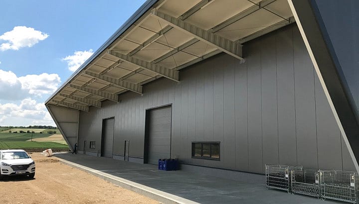 Wärmegedämmte Lagerhalle mit vertikalverlegten Sandwichpaneelen und 2 m breitem Bogenlichtband im First mit integrierten RWA-Klappen