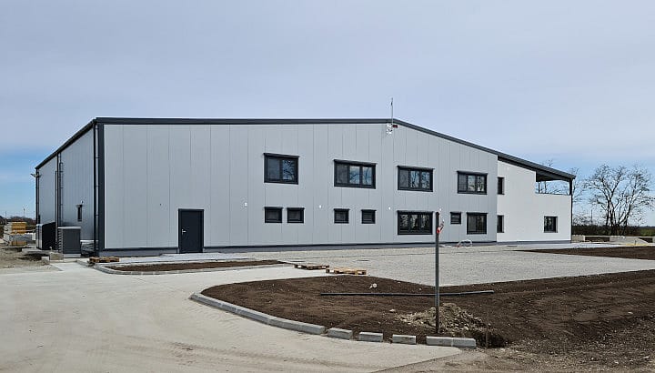 Produktionshalle mit Sandwichpaneelen, giebelseitig an Bürogebäude angebaut, mit Bogenlichtband im First samt RWA-Klappen und längsseitiger Anschleppung, Gebäudehülle sowie Tragkonstruktion mit Feuerwiderstandsklasse REI30.